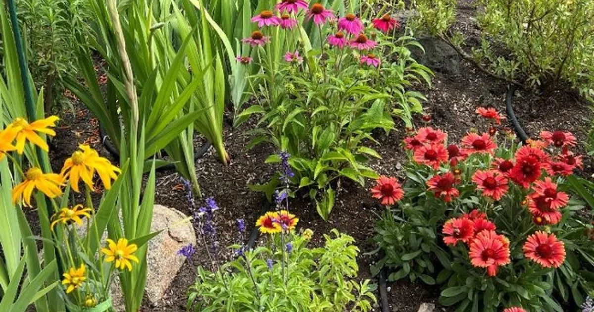 This plant blooms from summer to fall, and has yellow daisy-like flowers with a prominent black or brown seed head. It can grow 2 – 4' tall and blooms profusely whether deadheaded or not, although deadheading makes it tidier. It is easy to grow and tends to spread. It dies back in winter. This photo shows yellow Rudbeckia in the Demonstration Garden, along Sombrero® Tres Amigos coneflowers.