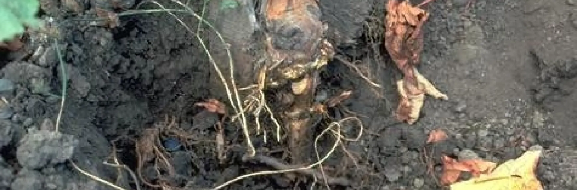 Trunk damaged by Phytophthora crown rot, Phytophthora root rot. Credit: Amand N. KasimatisPhytophthora fungi cause a number of diseases with different names depending on the part of the plant affected: Roots (root rot), trunk (crown rot, collar rot or foot rot), and fruit (brown rot of citrus.) Phytophthora rot in general, can attack all herbaceous and woody plants, including deciduous fruit and nut trees as well as most ornamental trees and shrubs. Root rot destroys feeder roots that are weakened by excess soil moisture. Crown rot presents as beads of sap oozing from lower trunk lesions; the bark will be dark and slimy or rose-colored. However, the bark discoloration does not extend into the wood. The leaves of a plant affected by Phytophthora rot appear drought stressed in that the tree or plant will often show signs of wilting. The leaves may turn a dull green, yellow, or purplish color and drop. The tree or plant may decline over a period of several years before eventually dying, or it may die within a year. To avoid Phytophthora root rot, purchase healthy trees with rootstocks tolerant to pests and diseases. Proper soil preparation and good drainage are essential. To avoid crown rot, keep mounded soil and water away from trunk. Avoid damaging bark with lawn mowers and weed whackers. If infection of the trunk occurs, scrape away all diseased bark and include a buffer strip of about one inch of healthy light brown to greenish bark around margins. To view a video in which Farm Advisor Chuck Ingels distinguishes the symptoms caused by Phytophthora root and crown rot from those caused by bacterial canker in stone fruit orchards, click here. Additional Information can be found here.