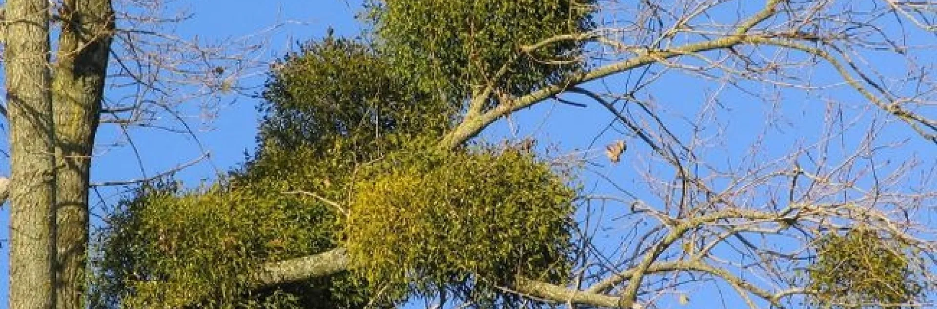 Leafy mistletoes have green stems with thick leaves that are nearly oval in shape. Plants often develop a rounded form up to 2 feet or more in diameter. The small, sticky, whitish berries are produced from October to December. Evergreen clumps of mistletoe are readily observed on deciduous trees in winter when leaves are off the trees. Mistletoe plants are either female (produce berries) or male (produce only pollen).