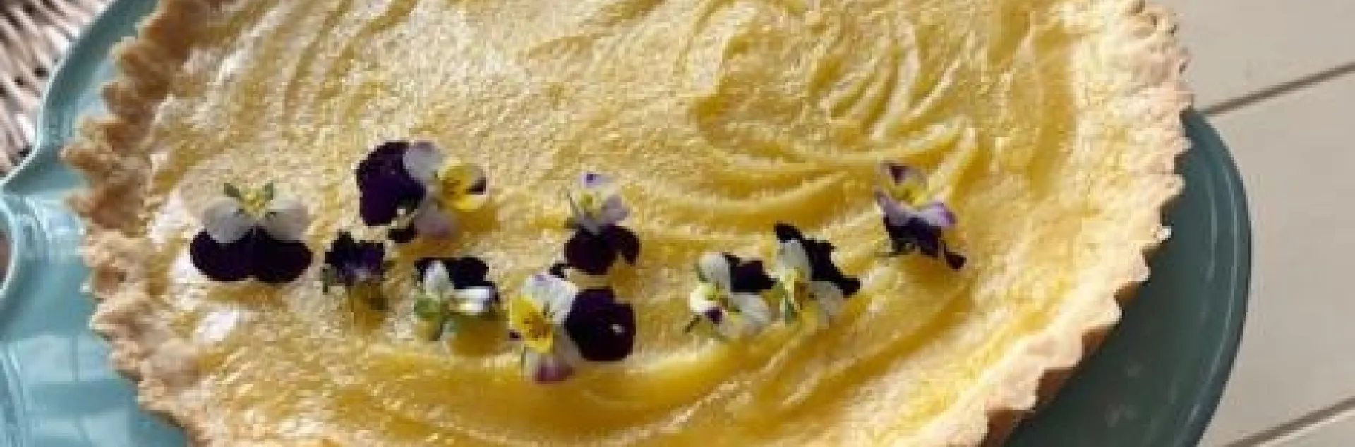 Preheat oven to 350? and spray a 9-to-10-inch tart pan with a removable bottom with nonstick spray. In a food processor or by hand, pulse the flour, sugar, salt, and butter until it looks like coarse crumbs. Press the crumb mixture into the prepared tart pan, tamping down the bottom and pressing the mixture up the sides. Bake the crust for approximately 10 minutes or until a golden brown. Once baked, set the crust aside to cool. In a medium saucepan whisk together the sugar, lemon juice, whole eggs, egg yolks, lemon zest, and butter pieces. Cook over medium-low heat, whisking constantly, until the mixture thickens and coats the back of a spoon; this could take 12-15 minutes. Spread the lemon filling onto the cooled crust with an offset spatula, to about ½ inch from the edges. Bake for an additional 5 minutes to set the lemon filling. Cool completely at room temperature. Chill in the refrigerator for at least 2-3 hours before slicing and serving. If desired, garnish the tart with violas.