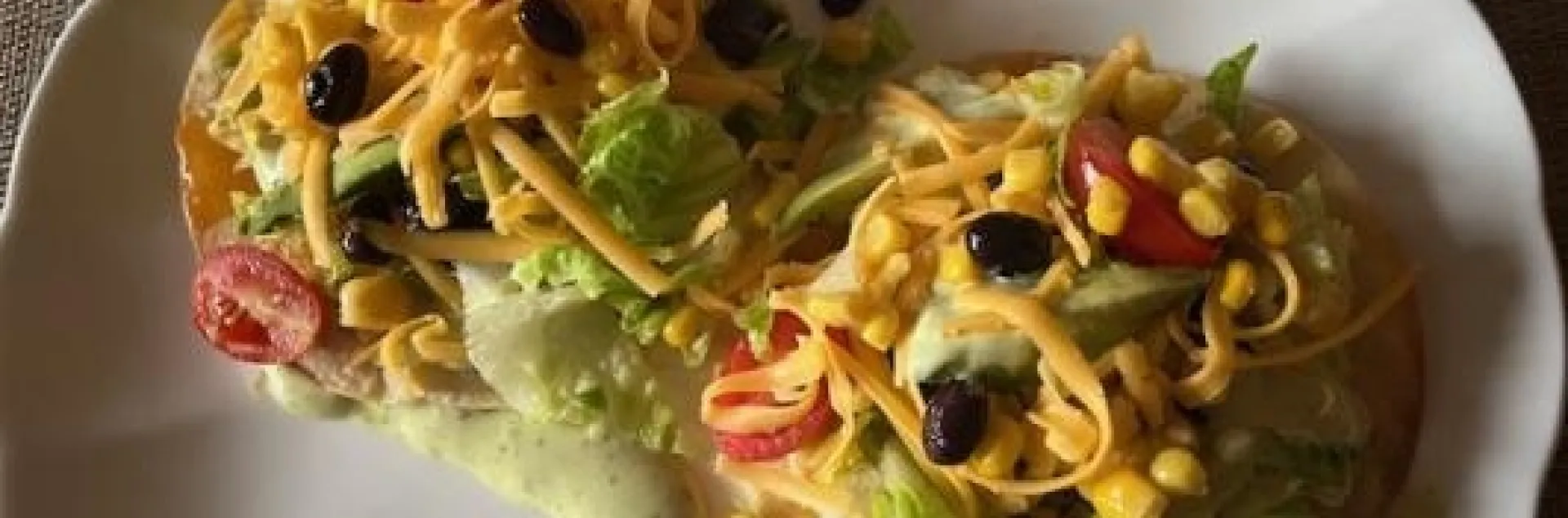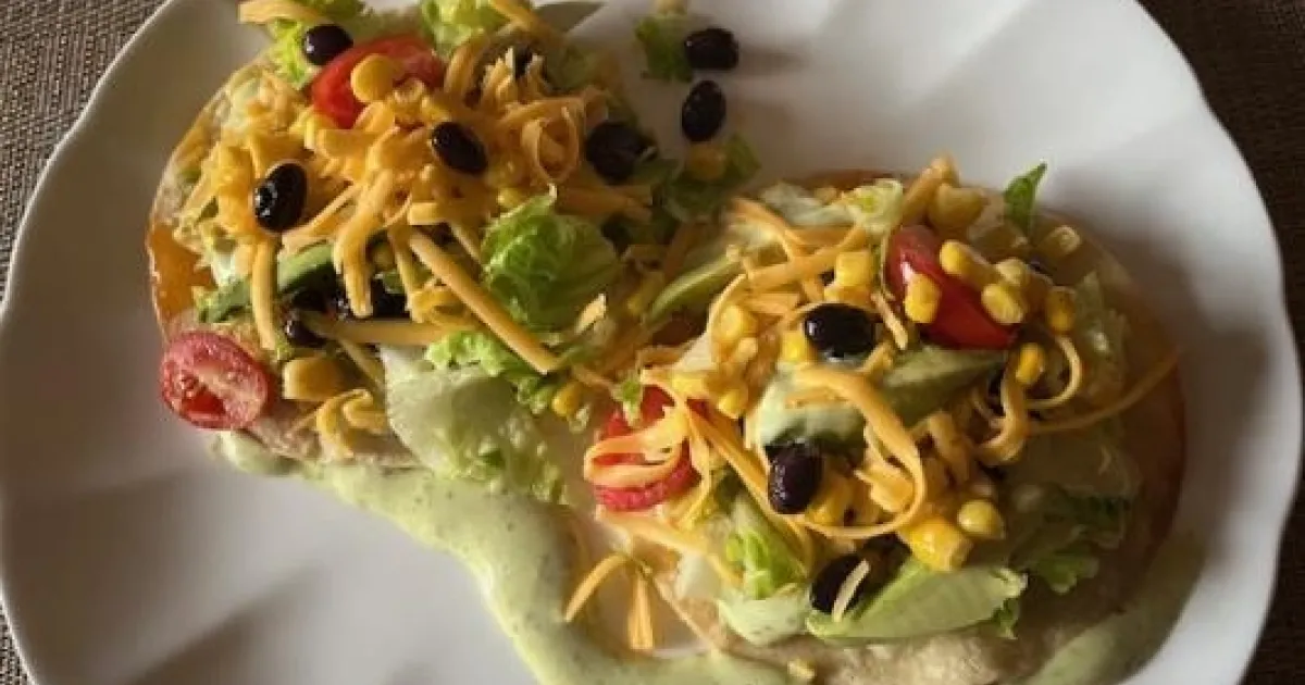 In a blender or using a whisk, blend together the dressing ingredients and set aside. Place the ingredients for the salad in a bowl and add half the dressing, toss, and add more dressing to your liking. Next, season with salt and pepper to your taste. Serve the salad on the tostada shells with some additional toppings of cheese and slices of avocado.