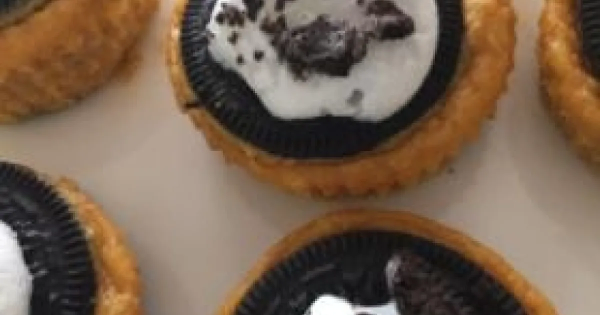 Preheat the oven to 350. Place 18 cupcake liners in cupcake/muffin pans. Beat the cream cheese and sugar until light and fluffy. Add the sour cream, pumpkin, nutmeg, cinnamon and flour and beat until creamy. Add the eggs and vanilla and beat until mixed in. Place half of an Oreo, frosting side up, in the bottom of 18 cupcake liners and spoon the batter into the liners. Place the other half of an Oreo into the top of the batter, frosting side down. Bake for 24 minutes. Cool in pan for 15 minutes before removing and placing on a wire rack to finish cooling. Keep refrigerated. Crush the remaining two cookies. Top the cheesecakes with Reddi Whip and cookie crumbs.
