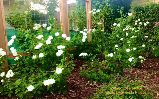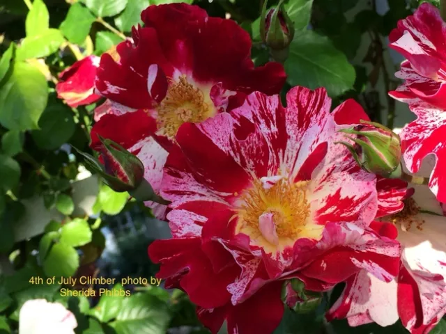 Rosa ‘Wekroalt' Fourth of July climber, introduced by Tom Carruth and Weeks Wholesale Rose Grower in 1999, is an All-American Rose Selections winner. Its red and white semi-double flowers, with golden stamens, sparkle like fireworks. With a moderate apple and rose scent, the bloom spans two inches in diameter. This vigorous climber can soar from 43 inches to 15 feet in height and spread 26 inches to 6 feet wide. It is a disease-resistant variety with glossy foliage, blooming in flushes from spring through autumn. It is my husband's favorite and I'm training three specimens to ascend our privacy screen, securing the growing canes weekly to the screen.