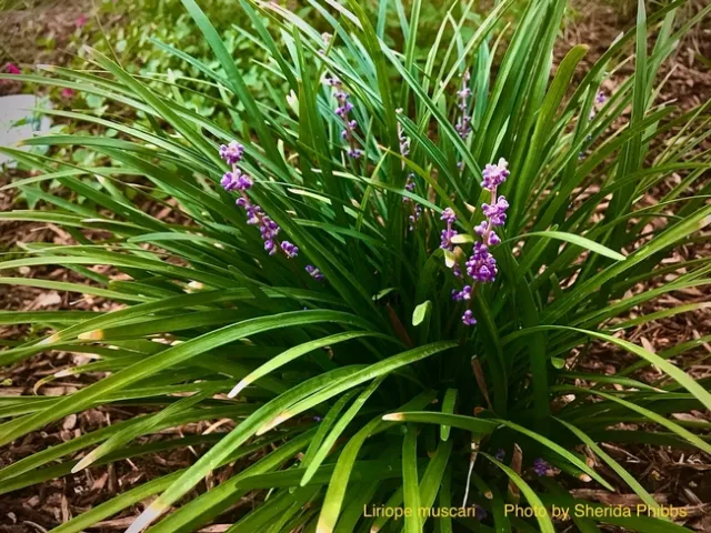 Liriope muscari - A Graceful Evergreen Late-Summer Bloomer: Seven Liriope muscari, also known as lilyturf, edge a section of my garden. Liriope muscari is a versatile, low-maintenance perennial that adds texture and color to gardens. They form dense clumps of grass-like green foliage with spikes of purple, lavender or white flowers in the late summer. They typically grow 9 to 18 inches tall and spread 12 to 24 inches wide. They prefer partial shade but can tolerate full sun with afternoon shade. Once established it is relatively drought tolerant. If needed, prune during the early spring, cutting back old leaves to encourage new growth. Divide clumps every few years to maintain their vigor. They are generally pest-free and not prone to serious diseases. They are ideal for edging paths or borders, or as a ground cover to prevent soil erosion.