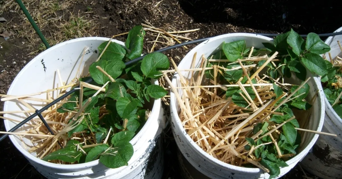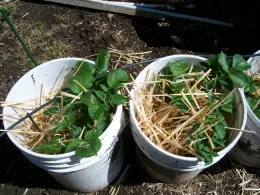 As the leafy part of the potato grows add straw or shredded paper or even some soil around the stems.