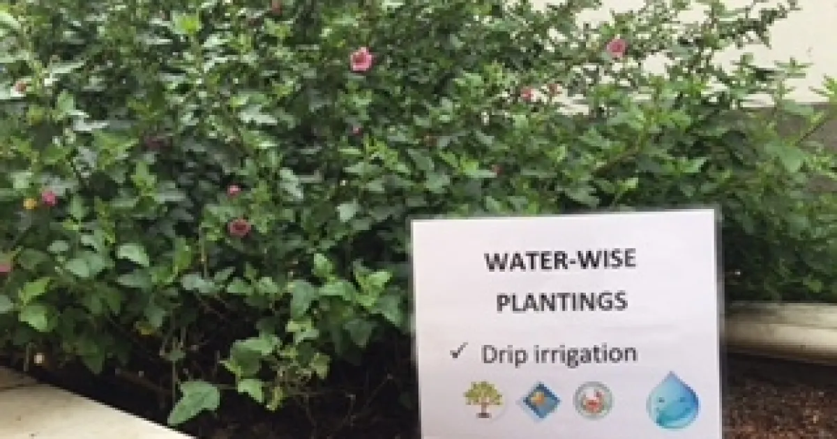 Garden bed with dense green shrubs and pink flowers beside a sign reading “Water-Wise Plantings – Drip Irrigation,” indicating a water-efficient landscaping setup.