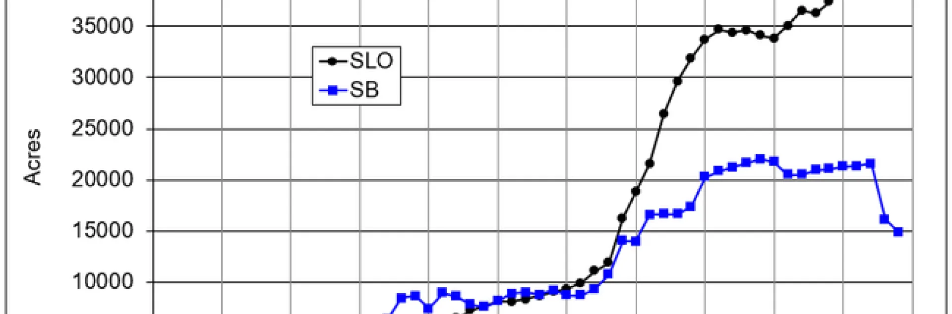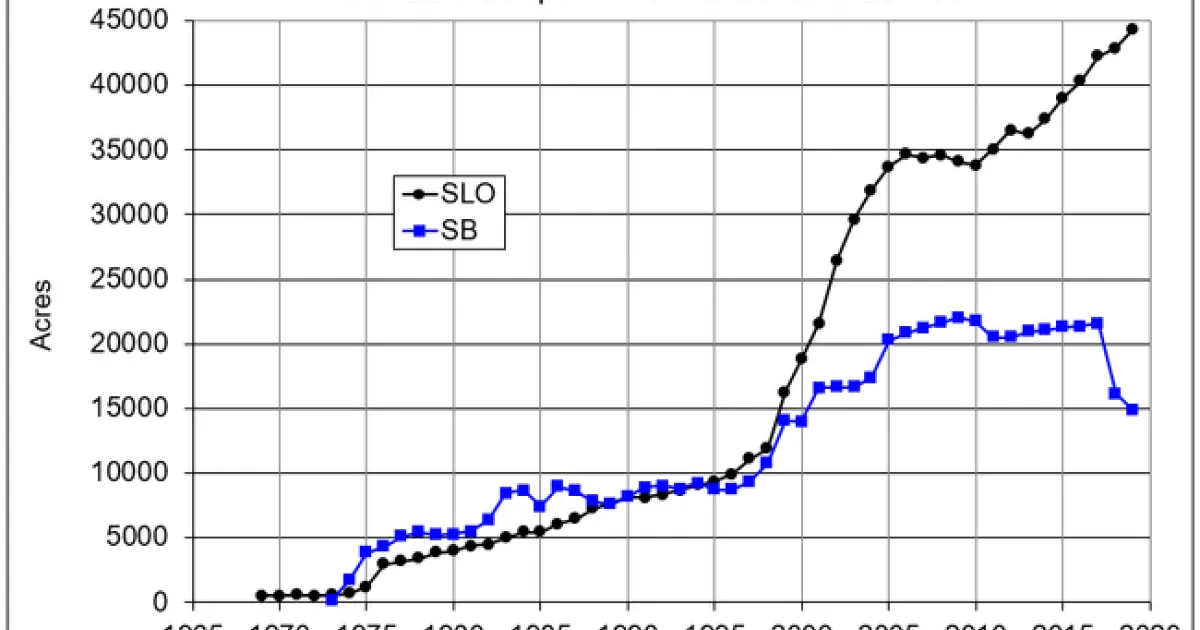 This difference can be explained in large part by the unequal crop options that are available for producers in the different counties. Farmers in much of Santa Barbara County have a large range of potential crops to choose from, including citrus, berries, flowers, cannabis, etc. The notable decline in wine grape acreage in that county in recent years likely reflects the shift in cropping to these other options which may offer better returns currently. Conversely most of the wine grape regions of San Luis Obispo County do not have the same number of crop options, due to the limitations of climate, water availability, and County restrictions on crops such as cannabis. Wine grapes are a very suitable crop for the particular growing conditions in the county, but the lack of alternative crops presents additional challenges during periods of excessive wine grape supply.