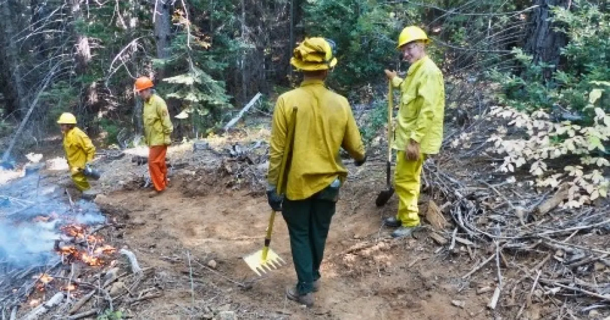 Participants at a University of California Cooperative Extension with their hand tools (including shovels, Pulaskis, and McCleods) are getting ready to cut fire line so that a prescribed fire will not escape containment. (Photo: Ames Gilbert)