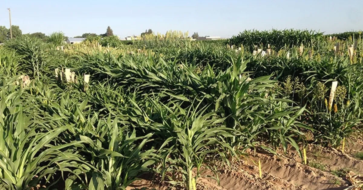 Sorghum growing in research plots at the UC Kearney Agricultural Research and Extension Center. (Photo: Peggy Lemaux)