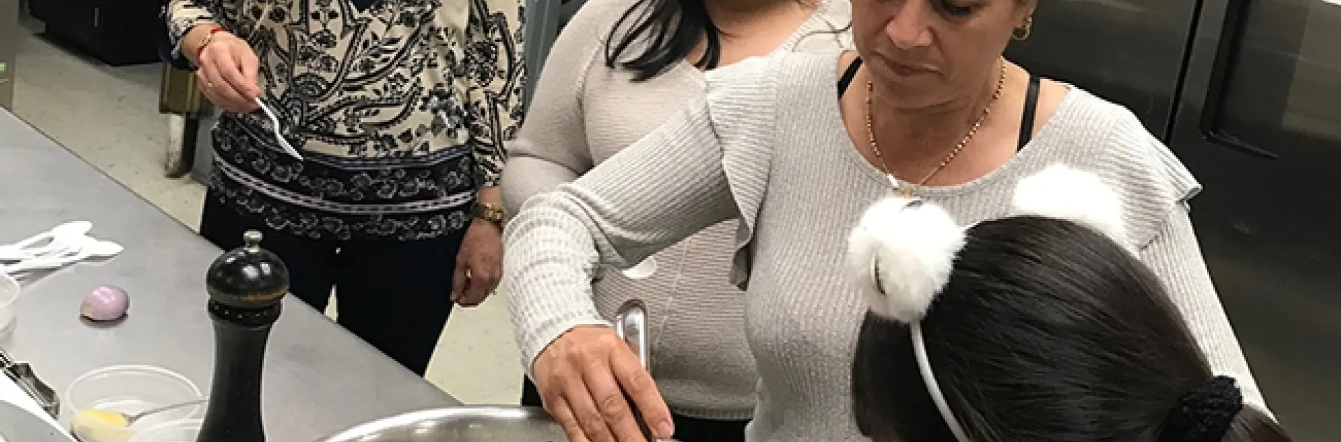 Chef Jeff started the workshop by introducing his culinary program. He shared cooking methodology and the use of "mother sauces," basic sauces that serve as a bases for flavoring different dishes. All participants had great questions for the chef, which indicated their interest in learning more about the measurements, ingredients and the application of "hot and cold" cooking techniques.