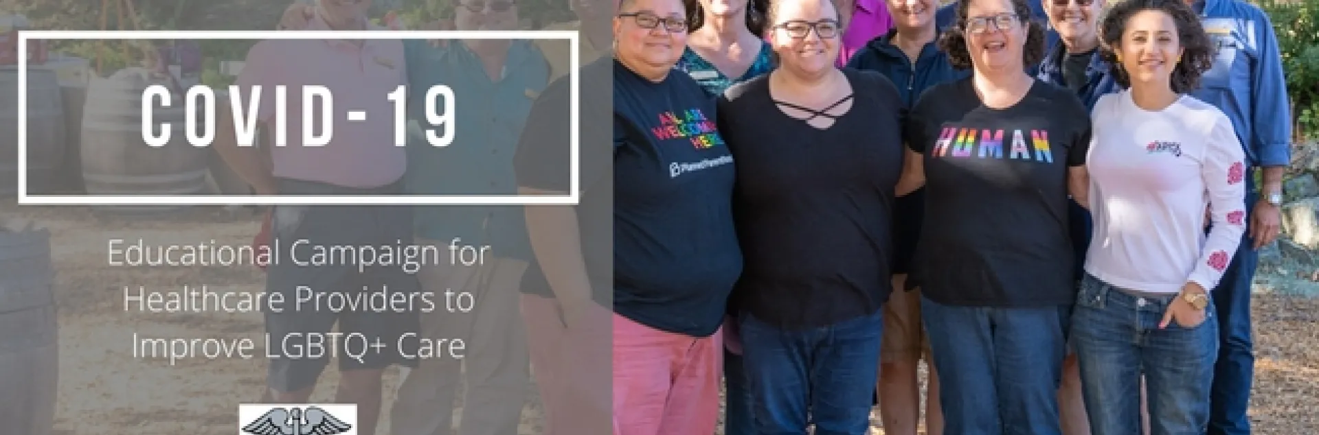 Group of people standing outdoors with text overlay reading “COVID-19 Educational Campaign for Healthcare Providers to Improve LGBTQ+ Care.”