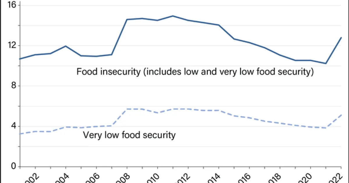 In their 2023 report, the USDA Economic Research Service notes that food insecurity increased in 2022 across all subpopulations and was significantly higher than the 10.2% prevalence of food insecurity recorded in 2021.