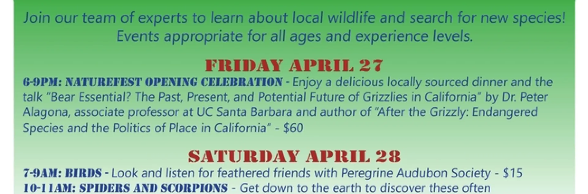 NatureFest brings together scientists, researchers and the community in a variety of experiences to enjoy the biodiversity found in the oak woodlands of Northern California. The celebration will begin with a delicious locally sourced dinner and the talk “Bear Essential? The Past, Present, and Potential Future of Grizzlies in California” by Dr. Peter Alagona, author and associate professor at UC Santa Barbara on April 27. Activities will continue bright and early on April 28 with the opportunity to join bird watching hikes with Peregrine Audubon Society and to explore the leaf litter of the woodlands in the search for scorpions with Dr. Lauren Esposito of the California Academy of Sciences. From 11am-3pm on the 28th scientists, naturalists, volunteers and community members of all ages are encouraged to join the “Bioblitz for All” in search of new species.