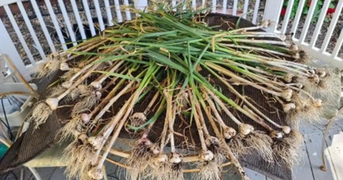 Using a garden fork (or a potato digging fork) gently lift the garlic bulbs out of the ground. Work the soil off the bulb and the roots, move the garlic to a well shaded area with good air circulation.