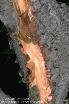The disease becomes inactive during the summer and winter when bark cankers harboring the pathogen may be seen. These can be removed by pruning out diseased wood, at least 6–10 inches below the visible infection, or back to the branch connection with a larger branch or the trunk. If the canker is on a large limb or the trunk but does not girdle the branch, you can try scraping the bark away until no more discoloration is seen. Dispose of all infected material in the trash and not in the compost!