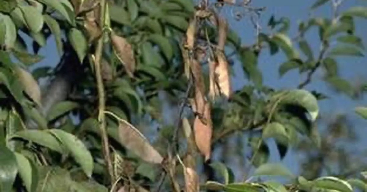 The first sign of a fire blight infection may be dark and dried-up new shoots and young fruit, which soon turn black. You might also see watery, amber-colored droplets oozing from affected areas.