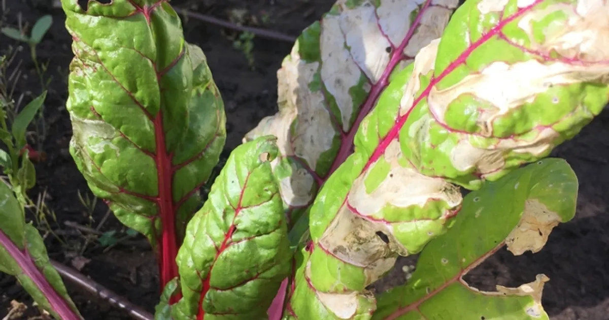 Client' Request: Hi! What bug (or other cause) is responsible for my “Bright Lights” Swiss chard leaves to look dry and brown? (See pictures below) What can I do to fix this?