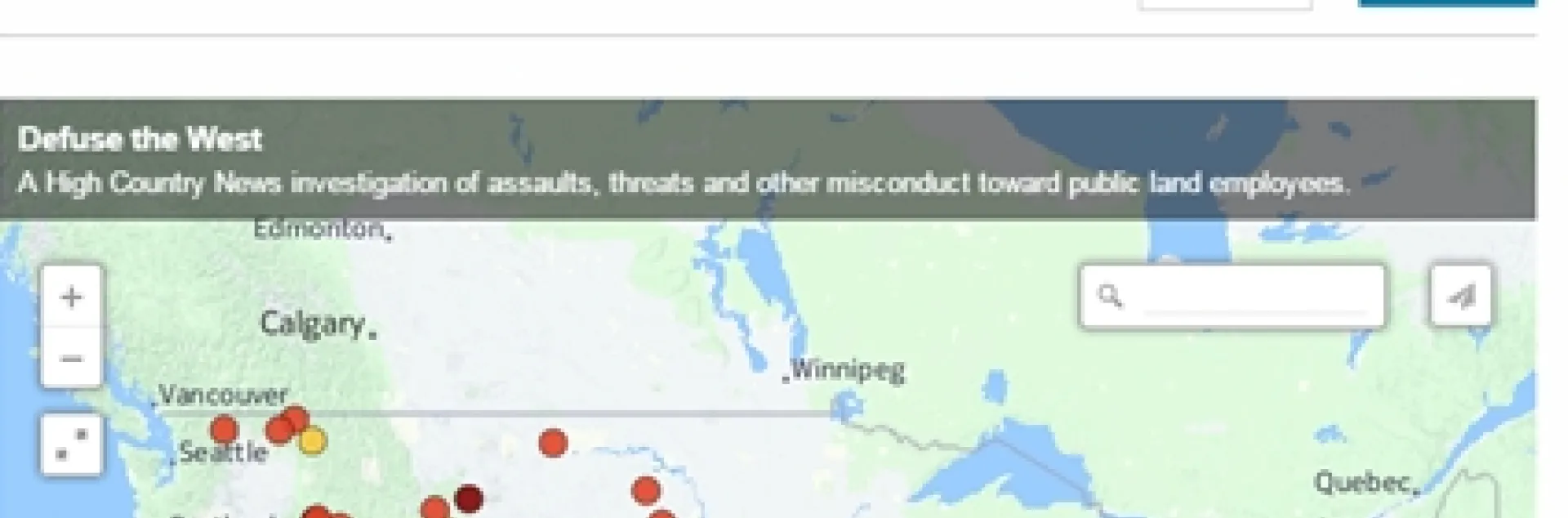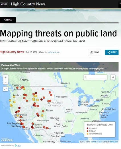 Violence against those who help manage and protect our public lands is an unfortunate reality in the United States. Though the recent Cliven Bundy standoff served to publicly highlight tensions between public lands managers and private citizens, that was not an isolated incident. High Country News has just released a map that its staff compiled to show incidents of intimidation of Federal officials across the West (http://www.hcn.org/issues/46.18/incidents-map). As the map shows, these issues are widespread.