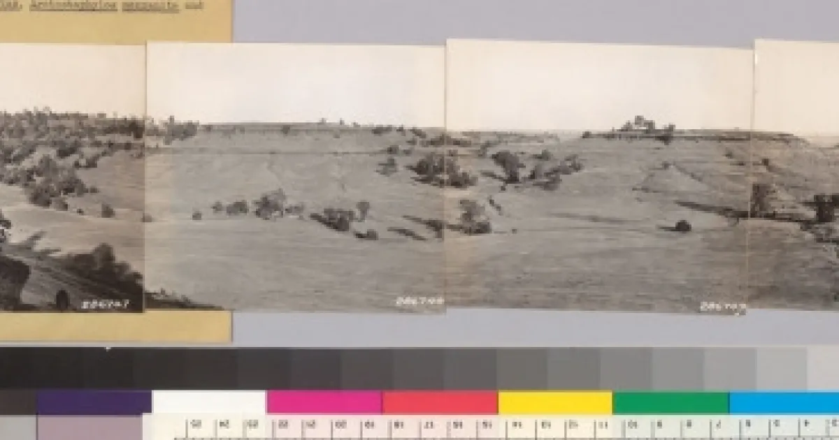 "Butte County. Panorama looking SW, S. SE and E from Neal Road. Note Juniperus californica in ravine. Woodland grass type of blue oak and digger pines with occasional Ceanothus cuneatus, Arctostaphylos manzanita and Rhus diversiloba."