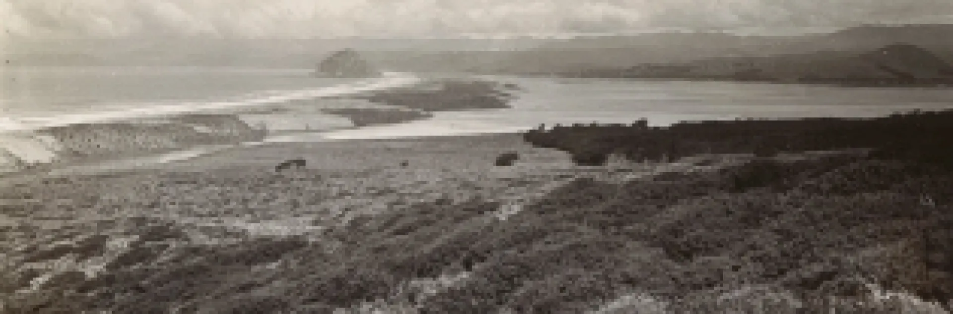 Date of original photo: Feb 25, 1936, taken in San Luis Obispo County, California, US. Looking north toward Morro Bay. Shows almost dense stand of Arctostaphylos morroensis in foreground. Quad name: Cayucos. Quad number: 132B. Reference to map: 1. Photographer: Albert Wieslander.