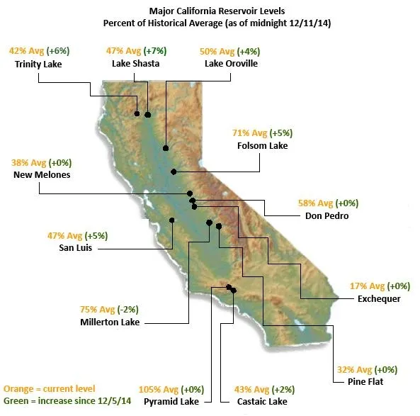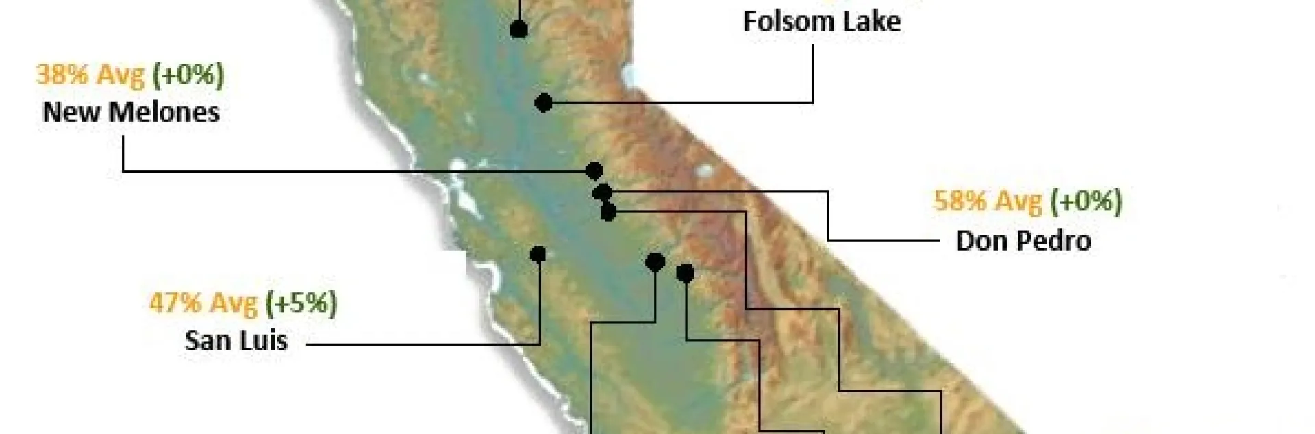 Major California reservoir levels (% avg) as of midnight yesterday compared to last week