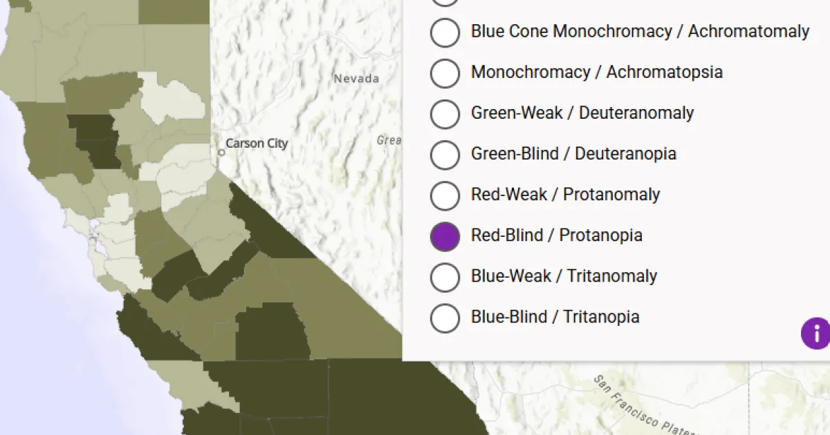 Red color ramp on California counties for monochromacy condition on Colorblindly extension