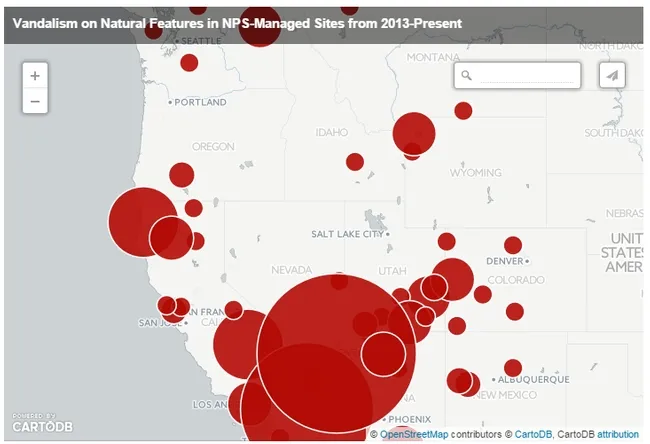 A webmap featured in an article in the High Country News shows where vandalism has been reported most in protected areas across the West since 2013. As the article associated with the map states, the areas most impacted are those closest to urban areas, particularly in the desert parks.