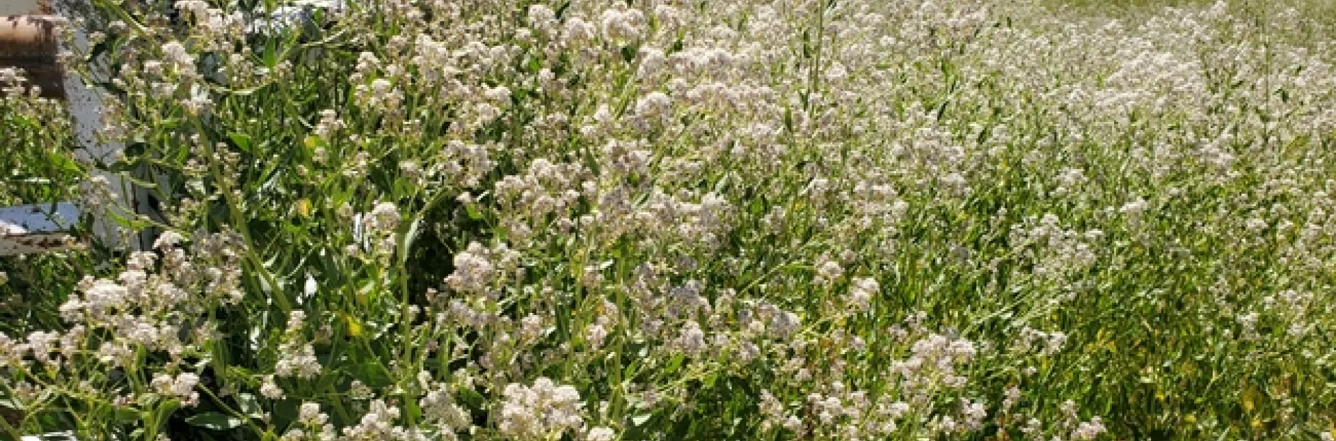 Perennial pepperweed (Lepidium latifolium) also known as tall whitetop is a root-creeping perennial weed. It is commonly found along roadsides, ditches, and drains. It is also a big problem in pastures, non-cropland, and even cropland that is not tilled on a yearly basis. Perennial pepperweed spreads by seed and root fragments and is very persistent and difficult to control once established.