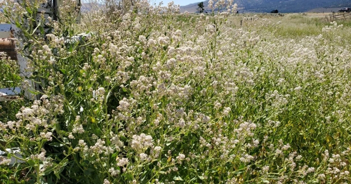 In areas where pepperweed patches are young and there are there are still desirable perennial grasses, broadleaf selective herbicides such as 2,4-D or chlorsulfuron can control the pepperweed while releasing the grasses from competition. For spots that will need to be replanted, 2,4-D or glyphosate may be a better choice, as it can take years for seeds to germinate in areas treated with chlorsulfuron or imazapyr. Imazapyr can be a good choice where bare ground is a desirable outcome, but should not be used around desirable vegetation as it can move in the soil. Chlorsulfuron can also move with soil so do not use this herbicide on ditches and along crop field borders. The herbicide you choose should be dependent on where the pepperweed is growing and what else is growing with it.