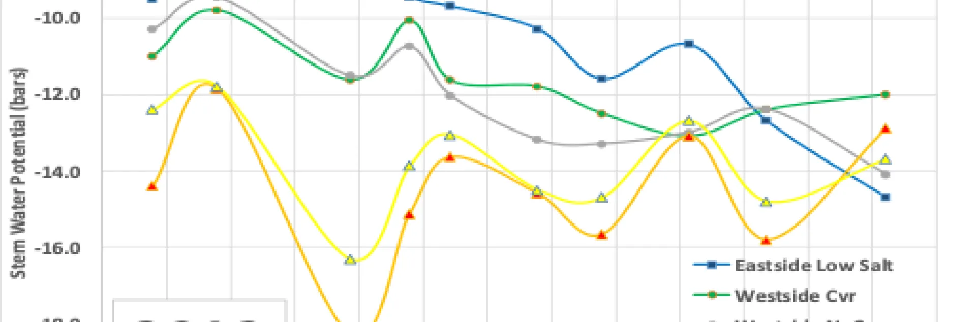 The above figure for 2020 shows that the non-saline Eastside and Westside fields are closer than they were for 2019 until the end of August. At this time the non-saline east field is showing the greatest stress at -14 bars. This field has been deficit irrigated due to infiltration and disease issues, receiving about 4 inches less water than the other fields since May. I can't say why, but from 7/23 – 8/31, the SWP for the MidSalt and HiSalt sites showed the same non-stressed value of -12 bars. The additional osmotic stress from the hi-salt area should cause an SWP that is at about -2 bars more stress than the mid-salt area and non-saline eastside and westside. Good irrigation scheduling and high-frequency pulsed irrigation are helping this saline field.