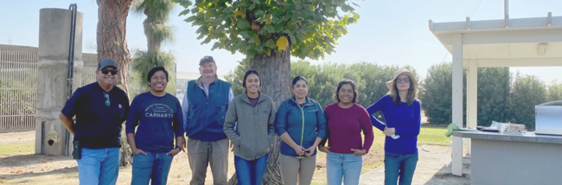 Andreas Westphal, UCR Professor of CE Nematology in the Department of Nematology at UC Riverside (UCR) was recently appointed as the Tukuji and Bettie L. Furuta Endowed Chair for his contribution to nematode IPM research in perennial crops. The Tukuji and Bettie L. Furuta Endowment was established in honor of the late Tukuji, who was also a CE Specialist and professor of botany and Plant Science at UCR. His wife Bettie L. Furuta, a horticulturalist and chair of the Watkins Society, donated their estate to support the study of control and pest management of insects and diseases. Westphal follows in their legacy as he continues to conduct research on nematodes, outreach to the community, advisement to growers, and exploring alternative methods for disease management. He is seen with his research group, from left to right Tom Buzo, Rainier Medina, Andreas Westphal, Savannah Coss, Maria Martinez, Zin Thu Zar Maung, Caroline Eberlein, missing Stephen Abbott.