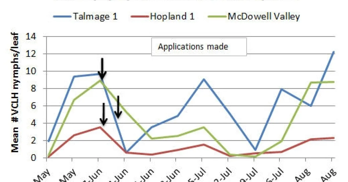 Due to the lack of biological control, effective early-season control of VCLH is critical. Based on monitoring, if control measures are needed, the optimum application period would be when the majority of the population is still in the younger nymphal stages. Depending on population levels at your site, follow-up applications may be required depending on previous treatments and leafhopper population thresholds, so it is important to continue to monitor for nymphs. Now would be a good time to consult your PCAs for materials, rates and timing advice for follow-up applications for leafhoppers.