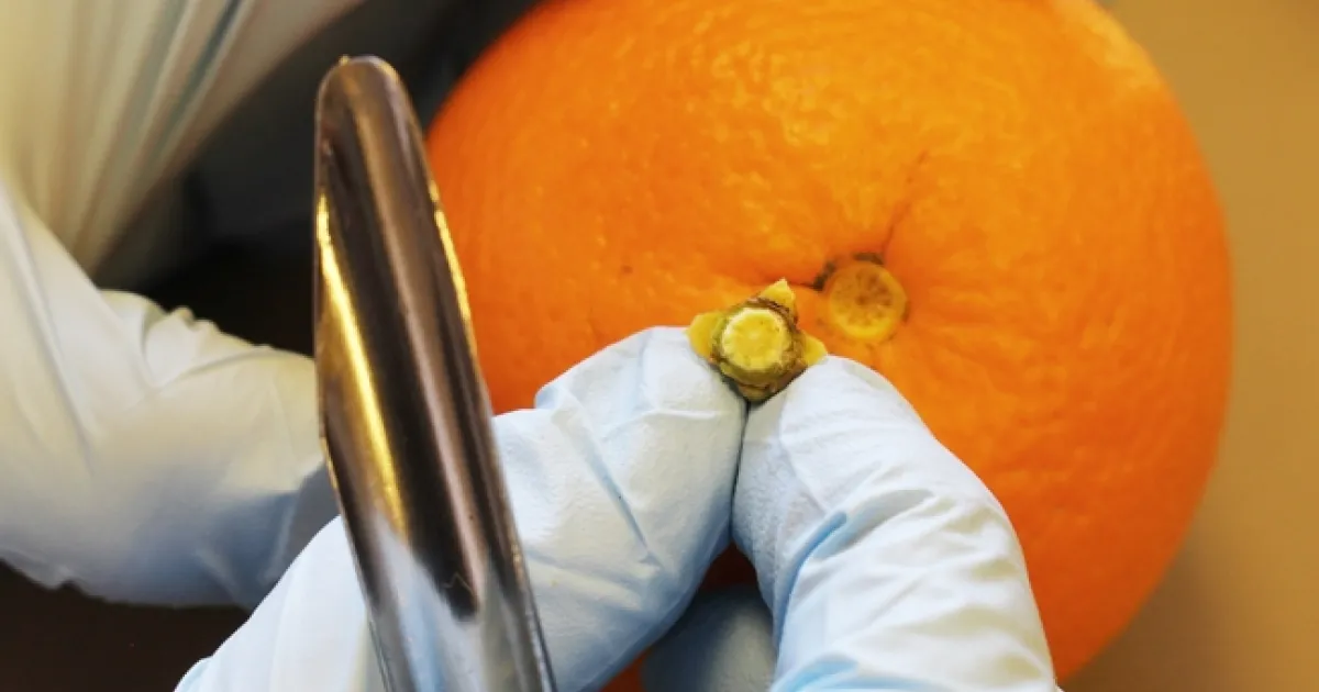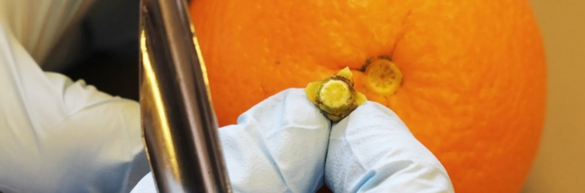 Dr. Beth Grafton-Cardwell's entomology staff researchers Stephanie Doria, Joel Leonard, and Matt Morris as well as Lindcove staff researcher Sal Barcenas have been on the hunt for Fuller rose beetle eggs in an experiment at Lindcove. Treatments of Sevin, Actara, Exirel and Minecto Pro were applied to skirt-pruned trees in August and October. Now is harvest time, and the LREC agricultural crews are picking all fruit from each treatment tree into separate bins (700-1000 fruit per tree) and the research staff is painstakingly removing the calyx from each fruit and examining that region for Fuller rose beetle eggs. From this study we will determine the level of efficacy of these foliar treatments. While Fuller rose beetle is not considered a damaging pest in California citrus, treatments are required by S. Korea to minimize the risk of transporting Fuller rose beetle to S. Korean where it is not currently found.