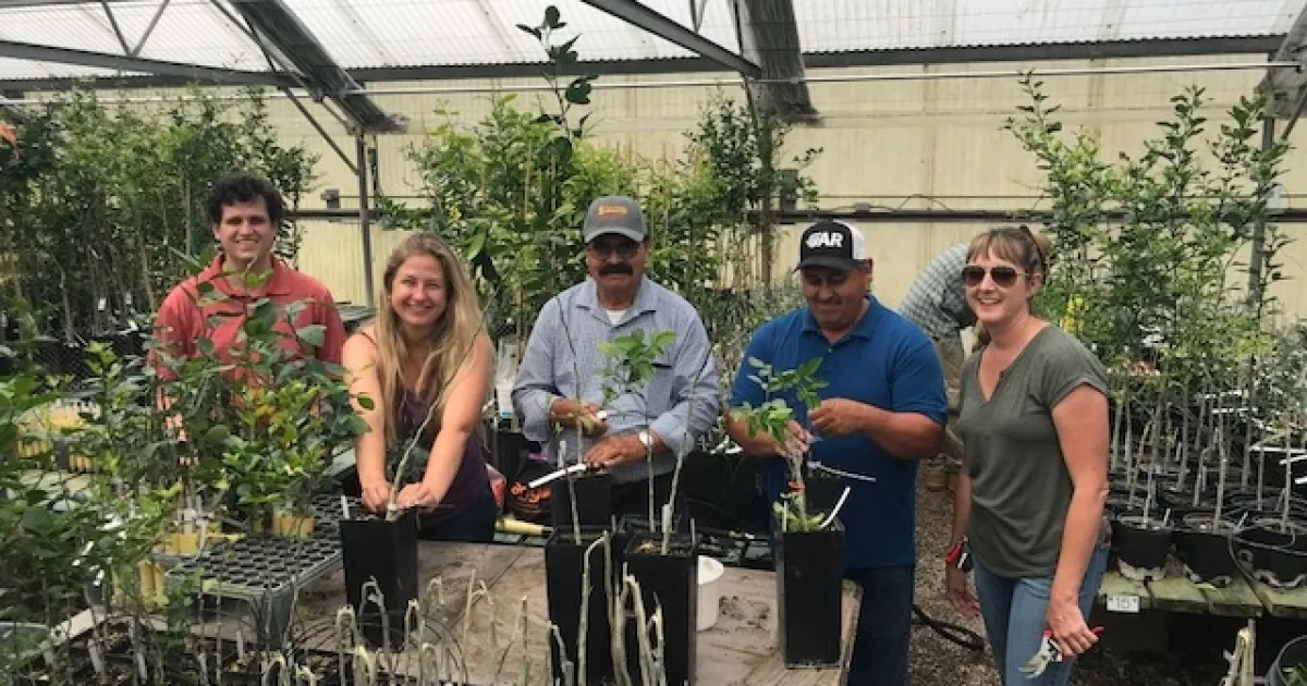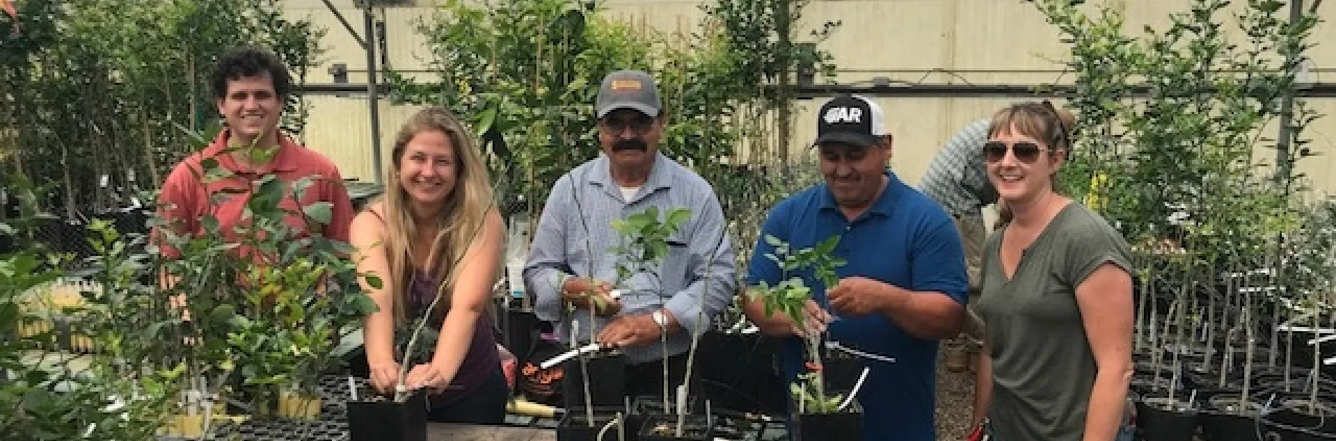 Each year, Agricultural Technician staff (Donald Cleek, Gerry Perez and Jose Trujillo) from the Lindcove Research and Extension Center travel to UC Riverside to assist the citrus breeding program of DR. Mikeal Roose and Dr. Tracy Kahn by grafting citrus seedlings for various experiments. LREC staff assisted Toni Sievert, Zach Thomas and Carene Trunnelle with budding 965 trees in two days! This is a wonderful example of LREC support of their scientists.