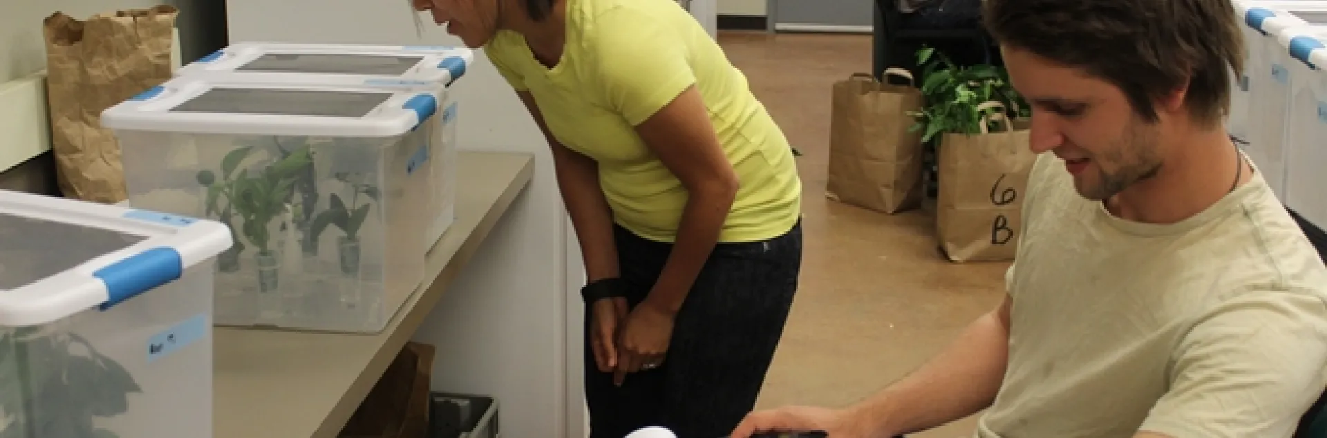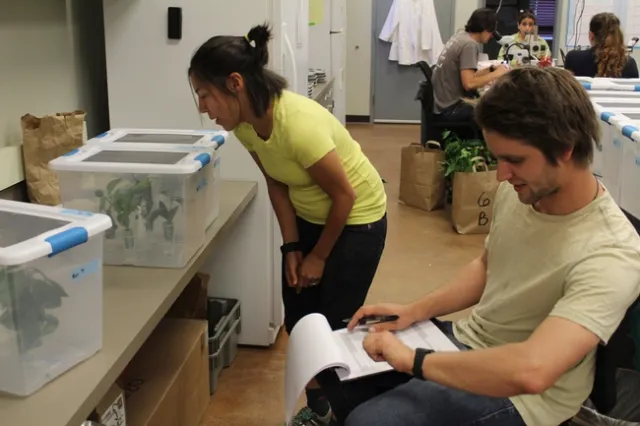 Hannah Kahl and Tobias Mueller, research staff for Dr. Bodil Cass and Dr. Jay Rosenheim in the Entomology Department of UC Davis are conducting experiments in the laboratory and orchards at Lindcove Research and Extension Center. The goal of the research is to determine if earwigs, katydids and citrus thrips cause significant damage to each of the commonly marketed groups of mandarins. If certain varieties are not susceptible to damage, this could greatly reduce pesticide treatments in those varieties. This work is being funded by the Citrus Research Board and the California Department of Pesticide Regulation.