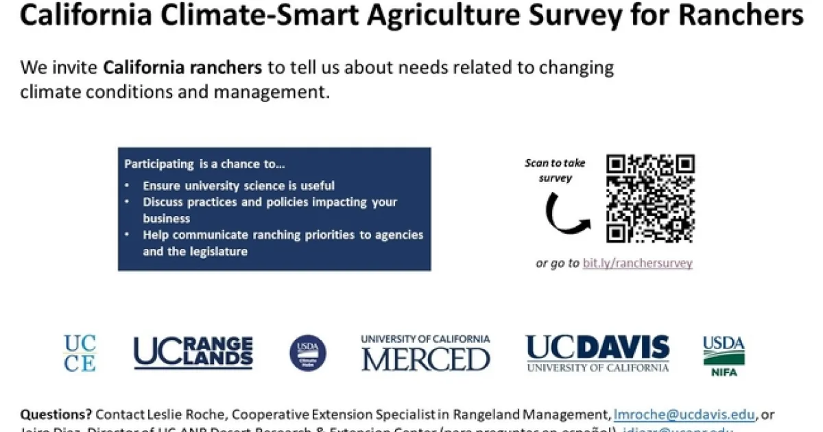 We invite you to participate in a survey about California ranchers' and farmers' concerns, perceptions, information, and education needs related to changing climate conditions and adaptation. This survey is part of a research study funded by USDA National Institute of Food and Agriculture and conducted by researchers at UC Cooperative Extension, UC Davis, and the USDA California Climate Hub. Survey results will be used to develop extension and education programs for farmers and ranchers.