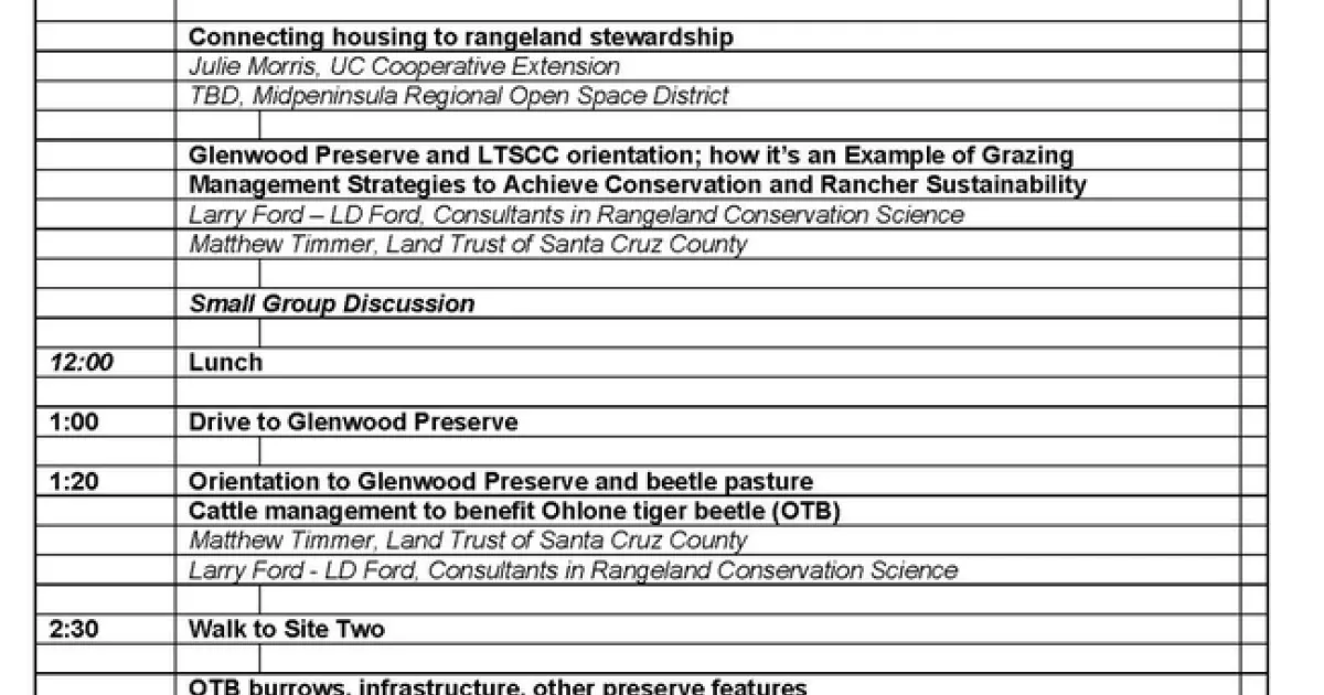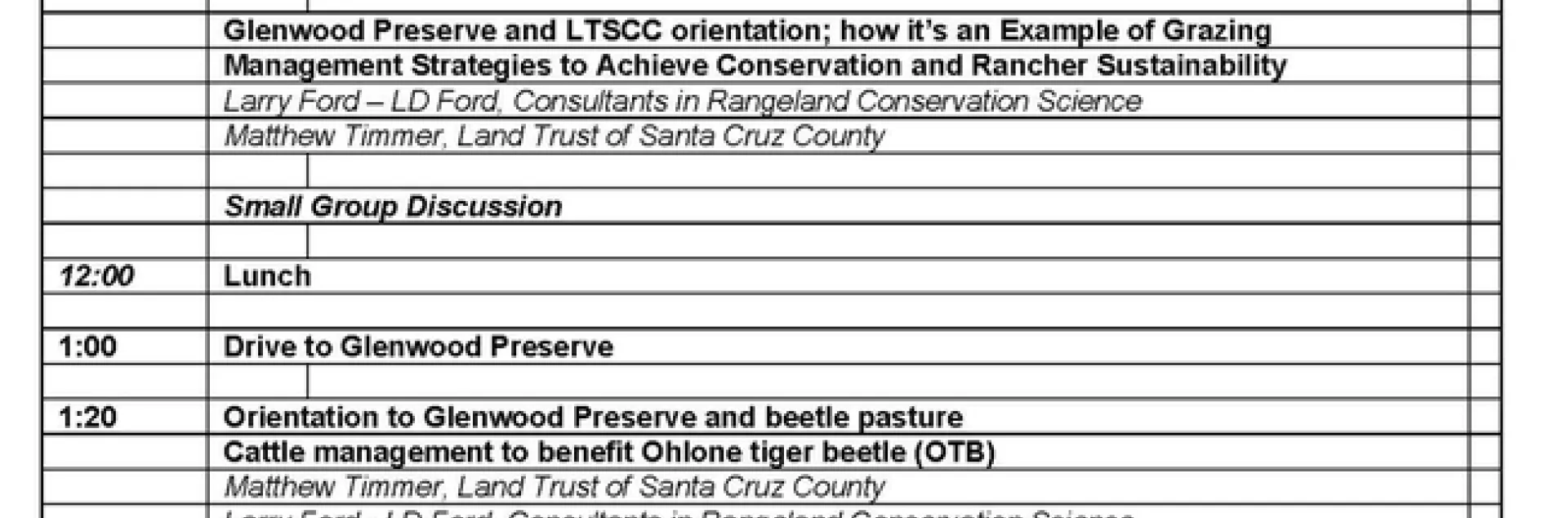 The workshop includes a visit to the Glenwood Preserve where the Land Trust of Santa Cruz County is working with a grazing lessee to conserve habitat for the Ohlone Tiger Beetle and other special-status species, reduce fire fuels, support compatible recreational uses, and meet the operational needs of the rancher.