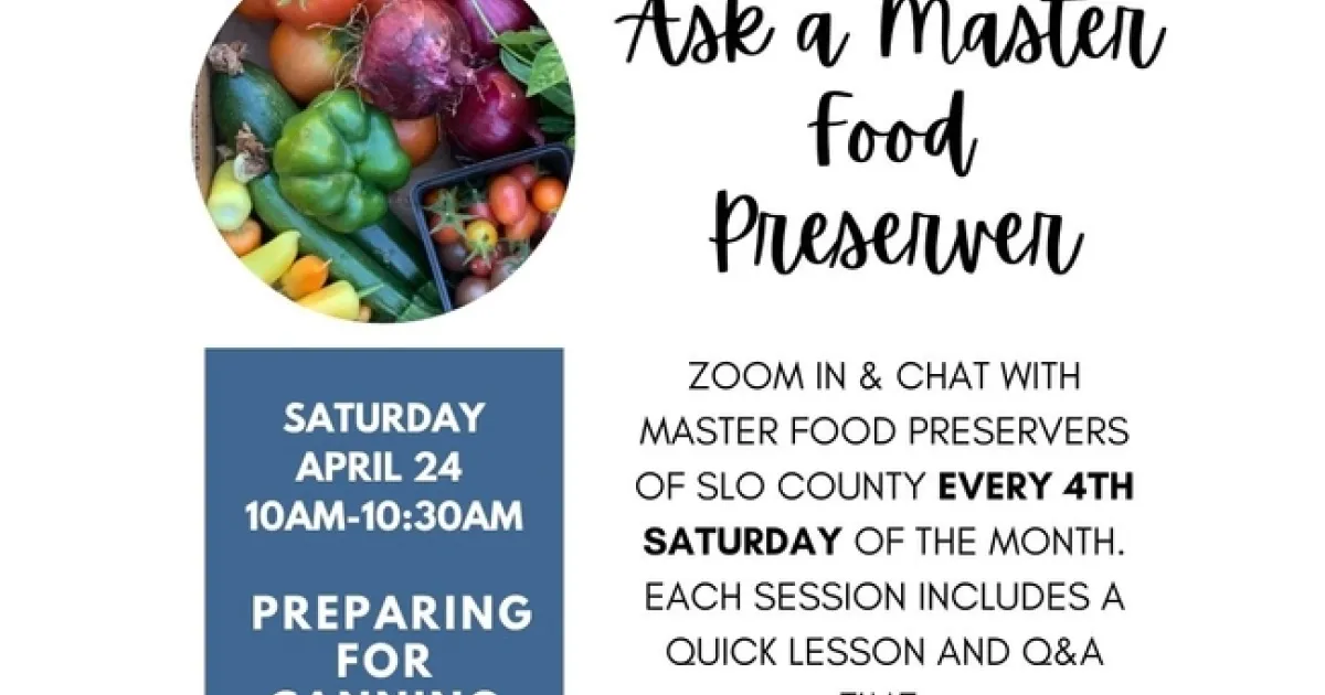 Learning how to preserve foods safely is key to your success. The UCCE Master Food Preserver Program is launching a new project called “Ask a Master Food Preserver”. Every 4th Saturday of the month @ 10AM beginning April 24, certified Master Food Preservers will host a live 30-minute Zoom meeting with the purpose of guiding you through the safe steps of preservation and answer any questions you may have.