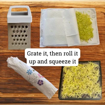 Zucchini holds a lot of moisture. The wetter it is, the longer it will take to dry in the dehydrator so you will want to dry the grated zucchini as much as possible. You can do this by placing the grated zucchini in a colander for about 15 minutes and pressing down on it to squeeze out the liquid or by squeezing the grated zucchini with a potato ricer. Another way, and is how I did it, is to lay some paper towels on a cloth towel; place a layer of grated zucchini on the paper towels; place another layer of paper towels on top of the zucchini; roll the towel up tightly and squish with your hands to absorb the liquid.