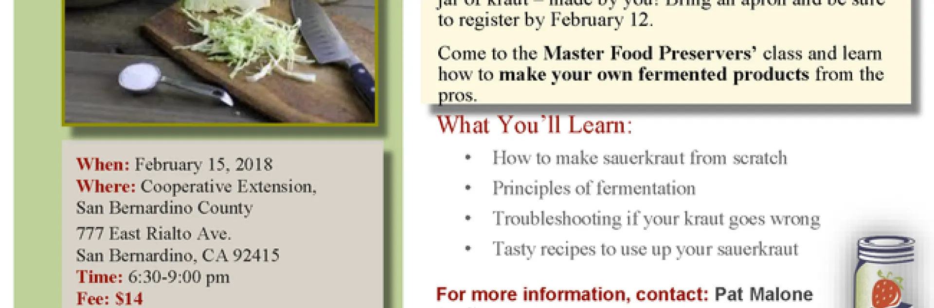 Make sure you attend this class for really good, easy-to-do, home-fermented sauerkraut.