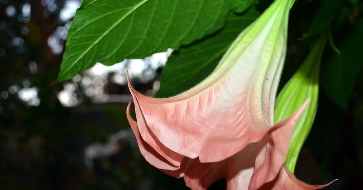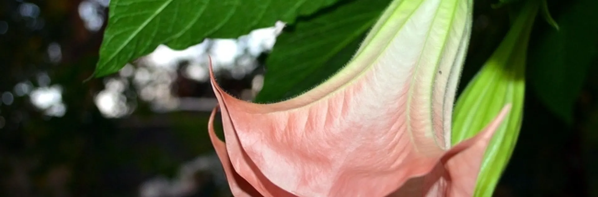 Brugmansias are sometimes called Angel Trumpets for the large dangling flowers they produce. These flowers are scented and attract pollinating moths. One species is pollinated by hummingbirds that are able to reach deep into the hanging flowers