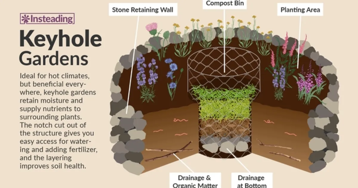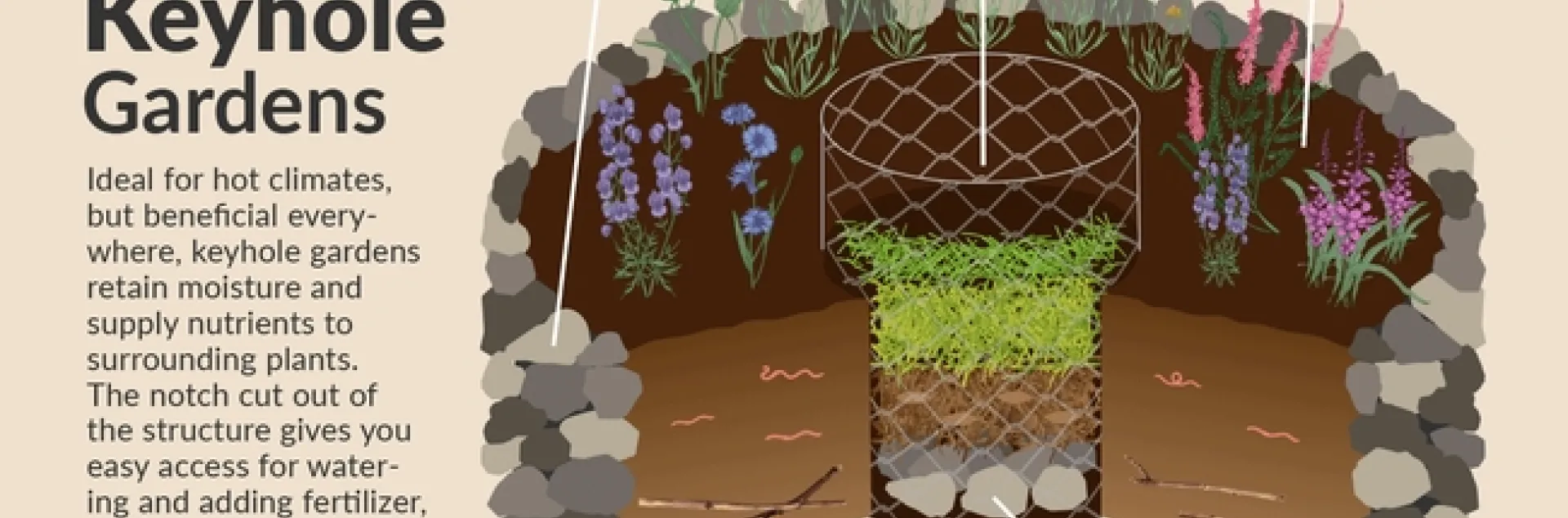 Keyhole gardens originated in Africa when people created kitchen gardens using materials they had lying around. The design is circular with a keyhole-like entrance. A worm compost bin made out of chicken wire or other materials is placed in the center, and the gardener puts kitchen waste in the bin. When the compost is ready, it is spread over the garden.