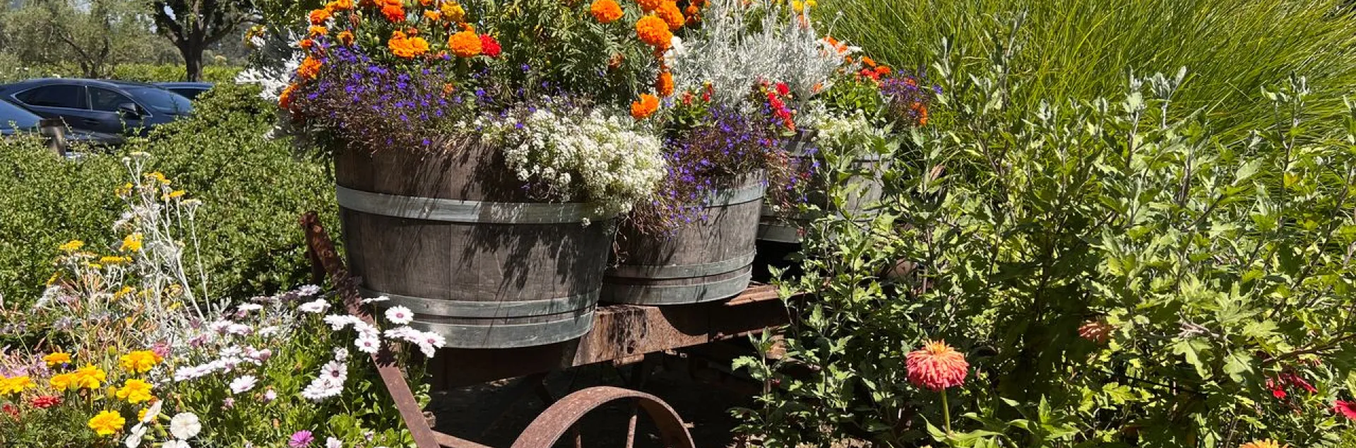Vanessa still starts seed for plants in Katie’s original garden shed. She starts all annual plants from seed or propagates them from cuttings. The only plants she purchases are small trees. We met at the front of the original winery building, which was built in the late 1800s, and were greeted by a charming burst of color from marigolds, daisies, dahlias and alyssum amongst an antique saw and used oak barrels.