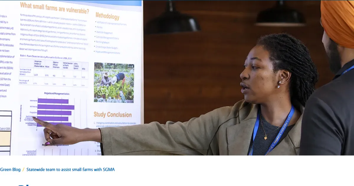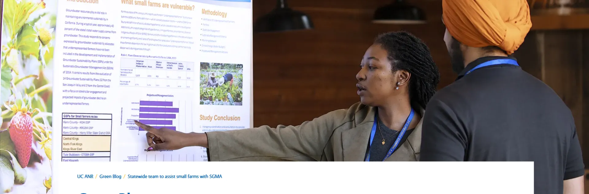 SGMA pide que se tomen en cuenta los intereses de todos los usos y usuarios del agua subterránea. En el 2022, UC ANR participó en un estudio de organizaciones no gubernamentales titulado “Underrepresented farmers and SGMA” para evaluar el impacto de SGMA en agricultores a pequeña escala. El estudio determinó que el impacto o beneficios de la implementación de SGMA en los agricultores a pequeña escala no ha sido adecuadamente considerado. Entre las recomendaciones del estudio se incluyen la disposición de asistencia técnica que permita a este sector de la agricultura participar y cumplir con la implementación de SGMA.