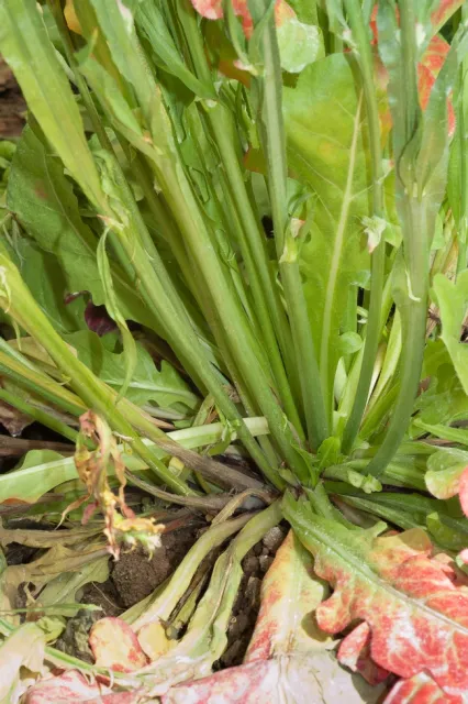 Another example is seen below where annual statice (Limonium sinuatum) was grown for cut flower production. The plants were densely grown in a greenhouse with chronic high humidity and poor air circulation. When flowers were cut, long stubs were left behind near the crown of the plant. The cut stubs became infected and then moved into the young petioles of nearby leaves.