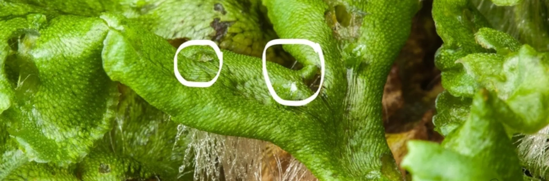 Liverworts can spread and propagate themselves with tiny sexually-produced spores and asexual propagules. The flat green leaf-like body of the liverwort spreads horizontally across the media surface by dividing into two branches at apical notches. Each apical notch contains a meristem (here circled in white), basically a growing-point, that can carry on growth laterally if there is media to grow on. Growing-point fragments that are dislodged or torn away from the mother plant have the potential to start new plants. Rhizoids, similar to root hairs, can establish new connections to the media to absorb water and mineral nutrients.