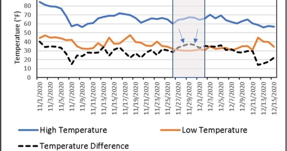 Freeze damage identified in young Tulare County orchards was likely caused by freezing temperatures in late November and early December 2020 (Figure 1). For seven consecutive days (11/26-12/2) temperatures plunged below freezing. This timeframe was also characterized by a large difference between high and low air temperatures, as indicated by the arrows in Figure 1. Greater differences between high and low temperatures are associated with an increased likelihood of freeze damage.