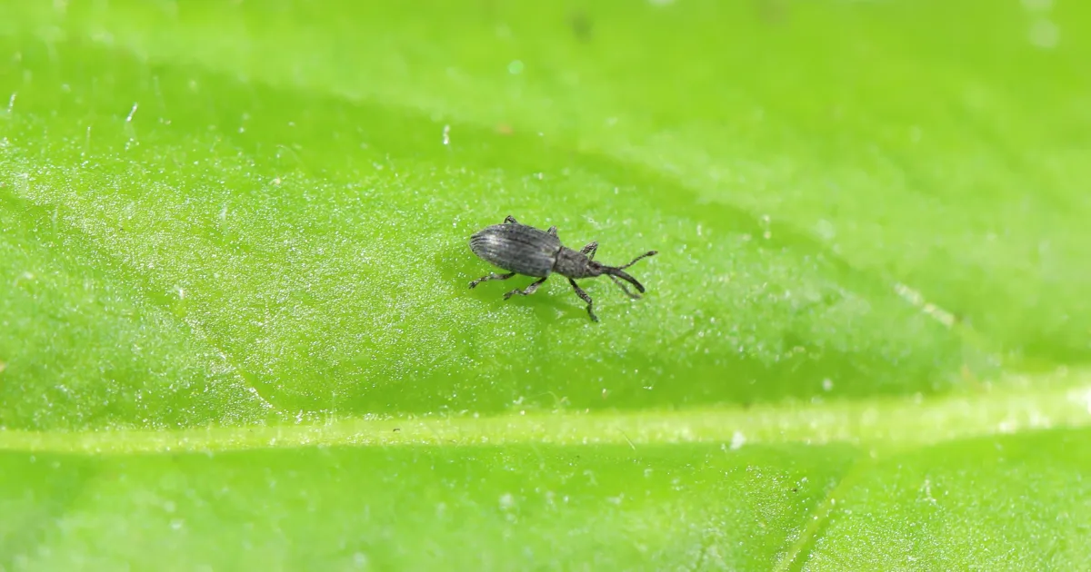 Yellow starthistle (or YST) is a harmful invasive plant that is established and widespread in California. Researchers from the United States Department of Agriculture (USDA) and the California Department of Food and Agriculture (CDFA) have worked to identify, release, and monitor several biological control agents of YST. One of these species is the rosette weevil (Ceratapion basicorne). Adult weevils feed on and lay their eggs inside of YST leaves. After hatching, the larvae burrow through the plant until they reach the upper part of the root. Rosette weevils can significantly weaken or kill YST, particularly when multiple weevils infest the same plant. The rosette weevil was approved for release in California in 2019, and efforts to establish populations across the state are ongoing. For more information, visit the WeedCUT webpage about the rosette weevil and other yellow starthistle biological control agents.