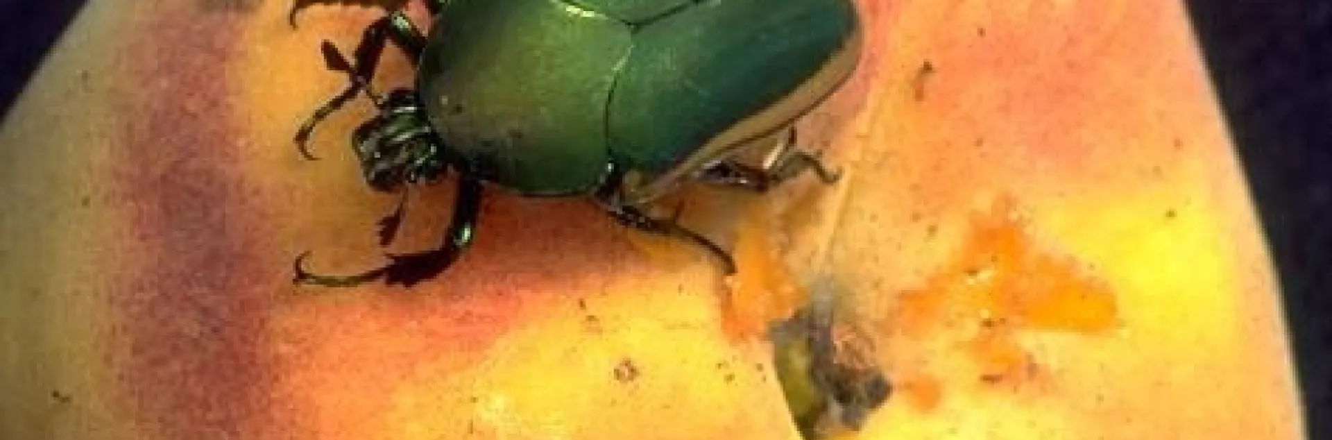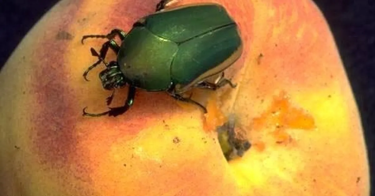 Green fruit beetles have a metallic green color and can be up to 1 1/3 inches long with prominent legs and antennae. The adults eat maturing soft fruit like figs and stone fruits, while the larvae (grubs) are found in compost or other decomposing matter. More on these occasional pests can be found on our website.