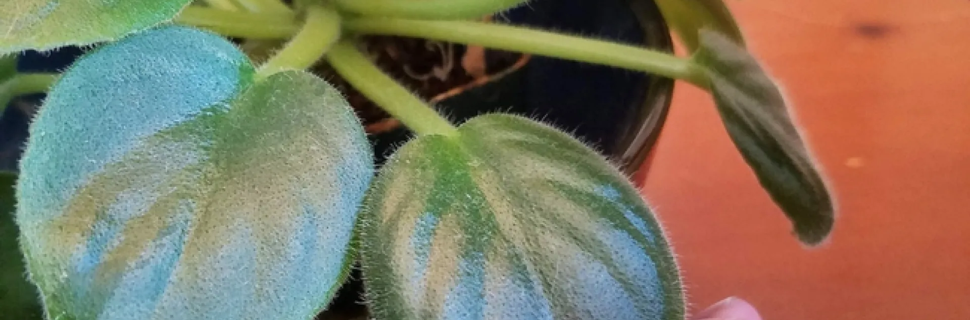 Inspecting the underside of a leaf on an African violet plant with purple flowers blooming.